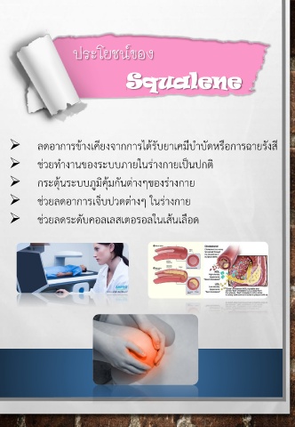 ประโยชน์ของ Squalene ลดอำกำรข้ำงเคียงจำกกำรได้รับยำเคมีบ้ำบัดหรือกำรฉำยรังสี ช่วยท้ำงำนของระบบภำยในร่ำงกำยเป็นปกติ กระตุ้นระบบภูมิคุ้มกันต่ำงๆของร่ำงกำย ช่วยลดอำกำรเจ็บปวดต่ำงๆ ในร่ำงกำย ช่วยลดระดับคอลเลสเตอรอลในเส้นเลือด