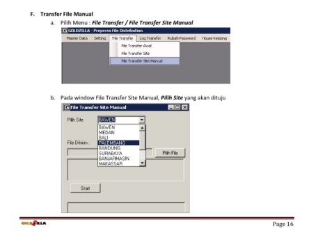 F. Transfer File Manual a. Pilih Menu : File Transfer / File Transfer Site Manual b. Pada window File Transfer Site Manual, Pilih Site yang akan dituju Page 16