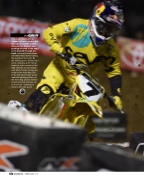 The crowd exploded as Stewart stole the lead in the first lap of his heat. It was obvious that Stewart was pushing his bike to the edge as he blasted through the track. He would swap places with Mike Alessi before taking the lead back from him. By the halfway point, Stewart had some company as Eli Tomac began to make moves for the lead. Stewart would strategi- cally block Tomac as they got closer to the finish flag. But
