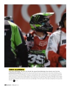 professional seasons. Although Chris has yet to set the world on fire, he has shown some signs of brilliance on his Monster Energy Pro Curcuit Kawasaki over the 2014- 2015 seasons. After a learning year in 2014, it was time for Alldredge to step up his results in the 2015 season. Coming out swinging at the first round of outdoors Chris left Hangtown with a 3rd place overal finish. Things where looking bright for the young star. For the remainder of the season Alldredge would struggle and would achieve only two more top ten finishes. If the number #35 can keep the rubber side down and put in some consis- tent rides his confidence can shoot up and we can see Alldredge in the top 5 week in and week out fighting for those podium finishes.