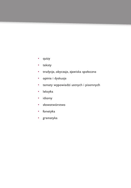 • quizy • teksty • tradycje, obyczaje, zjawiska społeczne • opinie i dyskusje • tematy wypowiedzi ustnych i pisemnych • leksyka • idiomy • słowotwórstwo • fonetyka • gramatyka