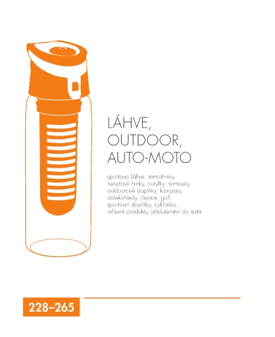 LÁHVE, OUTDOOR, AUTO-MOTO sportovní láhve, termohrnky, nerezové hrnky, butylky, termosky, outdoorové doplňky, kompasy, dalekohledy, čepice, golf, sportovní doplňky, cyklistika, reflexní produkty, příslušenství do auta 228–265