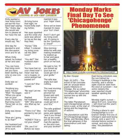 Sept. 22 (UPI) -- The arrival of fall coincides with an unusual twice- yearly milestone in Chicago, the so-called "Chicagohenge" phenome- non where the sunset and sunrise line up with the city's grid.