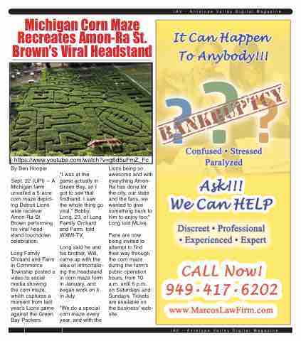 Sept. 22 (UPI) -- A Michigan farm unveiled a 5-acre corn maze depict- ing Detroit Lions wide receiver Amon-Ra St. Brown performing his viral head- stand touchdown celebration.