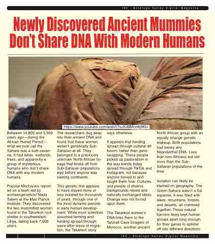 Popular Mechanics report- ed on a team led by archaeogeneticist Nada Salem at the Max Planck Institute. They discovered the two mummified women found in the Takarkori rock shelter in southwestern Libya, dating back 7,000 years.