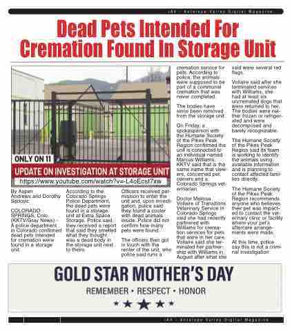 COLORADO SPRINGS, Colo. (KKTV/Gray News) - A police department in Colorado confirmed dead pets intended for cremation were found in a storage unit.