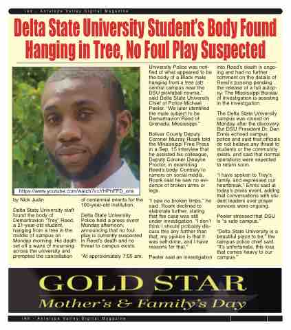 University Police was noti- fied of what appeared to be the body of a Black male hanging from a tree (at) central campus near the DSU pickleball course,” said Delta State University Chief of Police Michael Peeler. “We later identified the male subject to be Demartravion Reed of Grenada, Mississippi.”