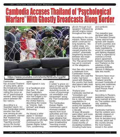 According to a Guardian report, for- mer Cambodian prime minister Hun Sen, now serving as sen- ate president, claimed that Thailand had been transmitting "haunting sounds" across the border despite a ceasefire