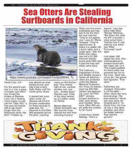 Authorities are stumped. Relocation is off the table— otters return like furry boomerangs. The best defense? Never turn your back. As Sharma puts it, “In Santa Cruz, the line- up has a new apex predator, and she’s got better balance than half the grooms.”