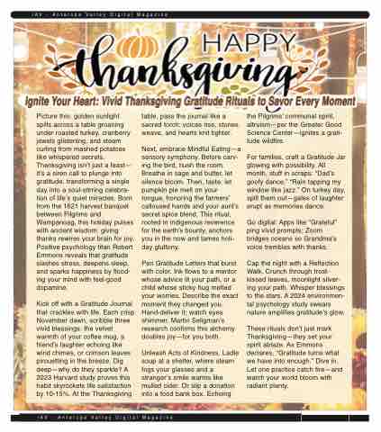 Picture this: golden sunlight spills across a table groaning under roasted turkey, cranberry jewels glistening, and steam curling from mashed potatoes like whispered secrets. Thanksgiving isn’t just a feast— it’s a siren call to plunge into gratitude, transforming a single day into a soul-stirring celebra- tion of life’s quiet miracles. Born from the 1621 harvest banquet between Pilgrims and Wampanoag, this holiday pulses with ancient wisdom: giving thanks rewires your brain for joy. Positive psychology titan Robert Emmons reveals that gratitude slashes stress, deepens sleep, and sparks happiness by flood- ing your mind with feel-good dopamine.