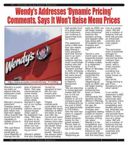 The statement came a little less than two weeks after Wendy's CEO and presi- dent Kirk Tanner said in an earn- ings call with analysts that the chain could begin testing new fea- tures including "dynamic pricing" in 2025, following the rollout of "dig- ital menu board enhancements," according
