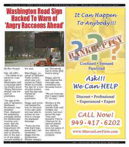 - The owner of an electronic road sign in Washington said a message warn- ing drivers about "Angry Raccoons Ahead" was the work of pranksters.