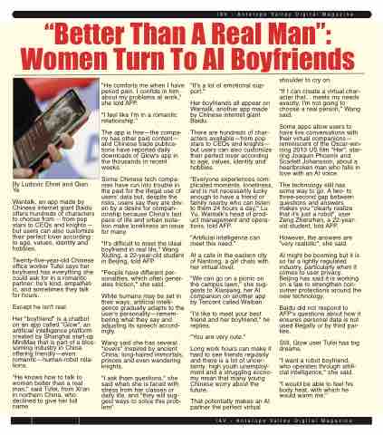 Twenty-five-year-old Chinese office worker Tufei says her boyfriend has everything she could ask for in a romantic partner: he's kind, empathet- ic, and sometimes they talk for hours.