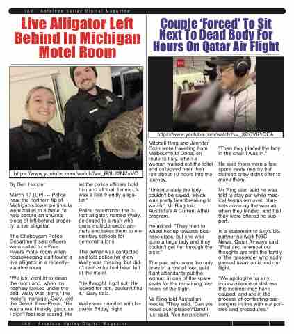 March 17 (UPI) -- Police near the northern tip of Michigan's lower peninsula were called to a motel to help secure an unusual piece of left-behind proper- ty: a live alligator.