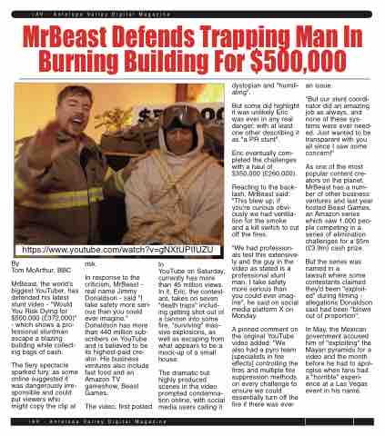 MrBeast, the world's biggest YouTuber, has defended his latest stunt video - "Would You Risk Dying for $500,000 (£372,000)" - which shows a pro- fessional stuntman escape a blazing building while collect- ing bags of cash.