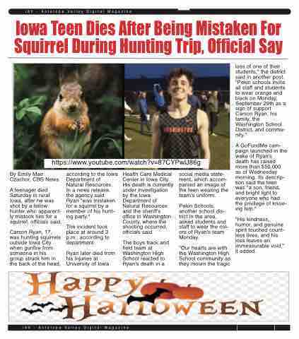 loss of one of their students," the district said in another post. "Pekin schools invite all staff and students to wear orange and black on Monday, September 29th as a sign of support Carson Ryan, his family, the Washington School District, and commu- nity."
