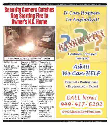 Oct. 15 (UPI) -- A security camera at a North Carolina firefight- er's home cap- tured the moment his family dog sparked a fire by chewing on a device with a lithi- um-ion battery.