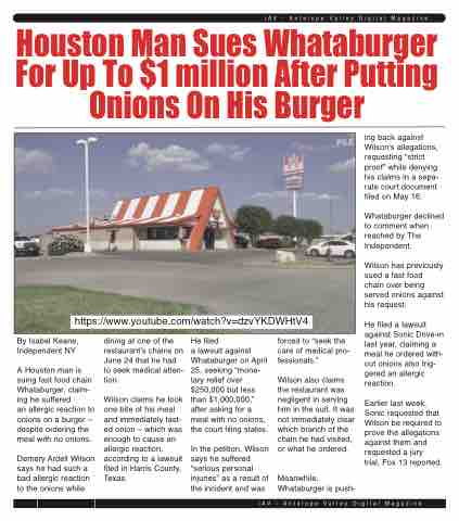 Wilson claims he took one bite of his meal and immediately tast- ed onion – which was enough to cause an allergic reaction, according to a lawsuit filed in Harris County, Texas.