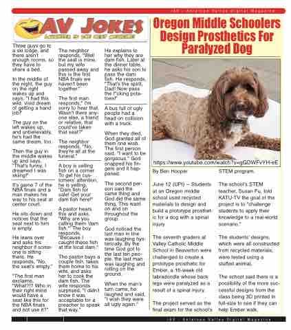 June 12 (UPI) -- Students at an Oregon middle school used recycled materials to design and build a prototype prosthet- ic for a dog with a spinal injury.