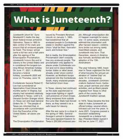 Juneteenth (short for “June Nineteenth”) marks the day when federal troops arrived in Galveston, Texas in 1865 to take control of the state and ensure that all enslaved people be freed. The troops’ arrival came a full two and a half years after the signing of the Emancipation Proclamation. Juneteenth honors the end to slavery in the United States and is considered the longest-run- ning African American holiday. On June 17, 2021, it officially became a federal