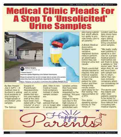 By Ben Hooper July 2 (UPI) -- A medical clinic in Scotland is asking local residents to stop bringing in "inappropriate or unsolicited" urine samples.