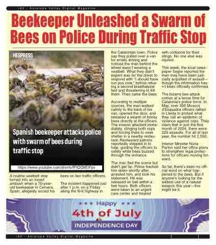 According to multiple sources, the man walked calmly to the back of his van, opened the door, and released a swarm of honey bees directly at the officers. The insects attacked imme- diately, stinging both cops and forcing them to seek shelter in a nearby restau- rant. Restaurant patrons reportedly stepped in to help, guiding the officers to safety while bees buzzed through the entrance.