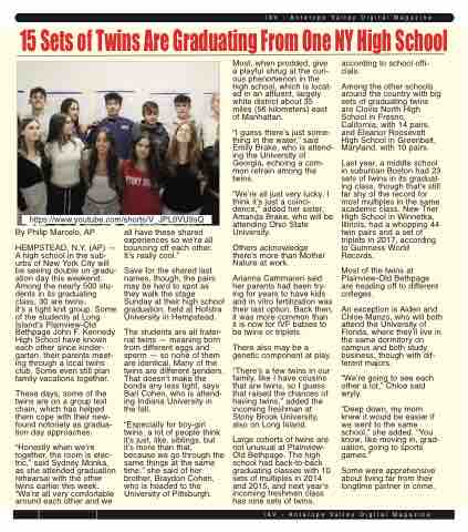 Among the other schools around the country with big sets of graduating twins are Clovis North High School in Fresno, California, with 14 pairs, and Eleanor Roosevelt High School in Greenbelt, Maryland, with 10 pairs.