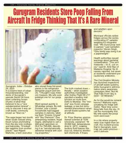 The truth crashed down – literally – when aviation authorities investigated after IndiGo Flight 6E-217 reported a lavatory mal- function en route from Delhi to Mumbai. The "min- eral" was frozen sewage leakage, a rare but docu- mented phenomenon when aircraft waste systems fail at altitude.