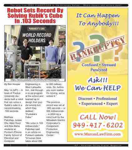 May 14 (UPI) -- A team of Purdue University stu- dents built a robot that can solve a Rubik's cube in a record-breaking .103 seconds.