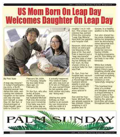 A leap-day miracle? In today's heartwarm- ing story, a North Carolina woman has defied the odds, wel- coming her newborn daughter on the same rare day she was born herself: a Leap Day. Dr. Kai Sun, a rheumatologist at Duke Health, gave birth to Chloe on