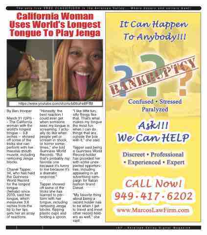 March 31 (UPI) - - The California woman with the world's longest tongue -- 3.8 inches -- showed off some of the tricks she can perform with her massive mouth muscle, including removing Jenga blocks.