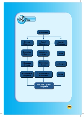 Peta onsep K Himpunan Konsep Relasi Operasi Himpunan Himpunan Himpunan Penyajian Himpunan Himpunan Bagian Irisan Himpunan Himpunan Gabungan Semesta Kuasa Kardinalitas Kesamaan Dua Selisih Himpunan Himpunan Sifat-sifat Operasi Himpunan 111