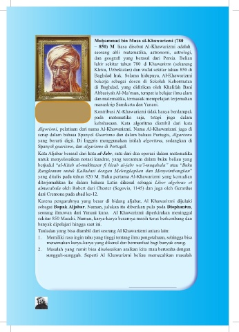 2. Masalah yang rumit bisa diselesaikan asalkan kita mau berusaha dengan aljabar dengan menyederhanakannya.Meskipun beliau sudah meninggal, namun karya-karya beliau, khususnya tentang aljabar masih dikenal hingga saat ini. “Apakah itu aljabar?” Untuk mempelajari lebih lanjut tentang materi aljabar, ikuti kegiatan pembelajaran berikut.Sumber:wikimedia.org/wikipediaMuhammad bin Musa al-K