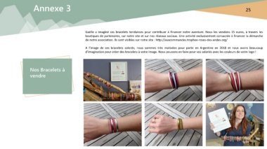Gaëlle a imaginé ces bracelets tendances pour contribuer à financer notre aventure. Nous les vendons 15 euros, à travers les
