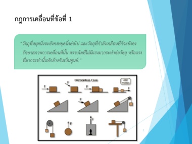 กฎการเคลื่อนที่ข้อที่ 1 “วัตถุที่หยุดนิ่งจะยังคงหยุดนิ่งต่อไป และวัตถุที่กําลังเคลื่อนที่ก็จะยังคง รักษาสภาพการเคลื่อนที่นั้น ตราบใดที่ไม่มีแรงมากระทําต่อวัตถุ หรือแรง ที่มากระทํานั้นหักล้างกันเป็นศูนย์.” 7