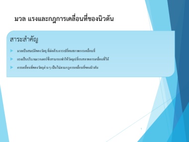 มวล แรงและกฎการเคลื่อนที่ของนิวตัน สำระส ำคัญ มวลเป็นสมบัติของวัตถุ ที่ต่อต้านการเปลี่ยนสภาพการเคลื่อนที่ แรงเป็นปริมาณเวกเตอร์ซึ่งสามารถทําให้วัตถุเปลี่ยนสภาพการเคลื่อนที่ได้ การเคลื่อนที่ของวัตถุต่าง ๆ เป็นไปตามกฎการเคลื่อนที่ของนิวตัน 1