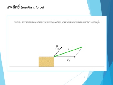 แรงลัพธ์ (resultant force) หมำยถึง ผลรวมของแรงหลายแรงที่กระทําต่อวัตถุเดียวกัน เสมือนกับมีแรงเพียงแรงเดียวกระท ำต่อวัตถุนั้น F 2 R F 1 3