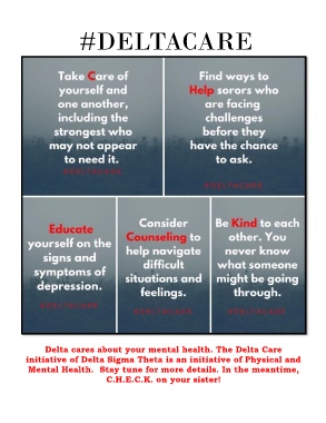 #DELTACARE Delta cares about your mental health. The Delta Care initiative of Delta Sigma Theta is an initiative of Physical and Mental Health. Stay tune for more details. In the meantime, C.H.E.C.K. on your sister!