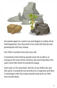 He awoke again to a warm sun and began to realize what had happened. Our mountain tree could tell that he was growing but still very slowly.