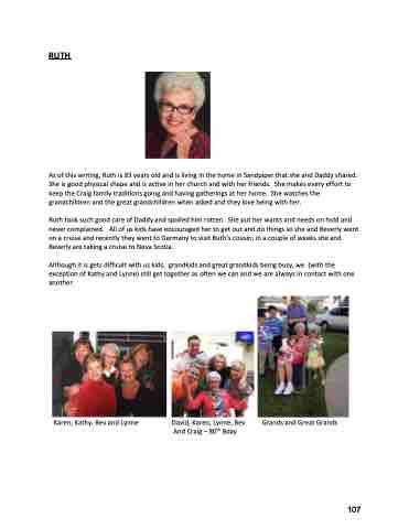 As of this writing, Ruth is 83 years old and is living in the home in Sandpiper that she and Daddy shared. She is good physical shape and is active in her church and with her friends. She makes every effort to keep the Craig family traditions going and having gatherings at her home. She watches the grandchildren and the great grandchildren when asked and they love being with her.