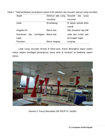 Tabel 1. Tabel perbedaan penanganan pasien kritis sebelum dan sesudah adanya ruang resusitasi