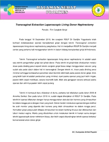 berhasil melaksanakan operasi transplantasi ginjal dengan teknik Transvaginal extraction