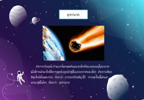 อุกกาบาต เกิดจากวัตถุแข็งจําพวกโลหะและหินขนาดเล็กที่ลองลอยอยูในอวกาศ เมื่อโคจรเขามาใกลโลกจะถูกดึงดูดเขาสูชั้นบรรยากาศของโลก เกิดการเสียด สีลุกไหมเปนแสงวาบ เรียกวา ดาวตกหรือผีพุงไต หากลุกไหมไมหมด ตกลงสูพื้นโลก เรียกวา อุกกาบาต 19