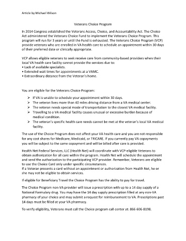 The use of the Choice Program does not affect your VA health care and you are not responsible