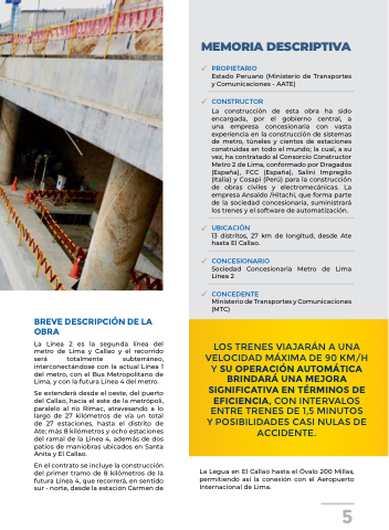 La construcción de esta obra ha sido encargada, por el gobierno central, a una empresa concesionaria con vasta experiencia en la construcción de sistemas de metro, túneles y cientos de estaciones construidas en todo el mundo; la cual, a su vez, ha contratado al Consorcio Constructor Metro 2 de Lima, conformado por Dragados (España), FCC (España), Salini Impregilo (Italia) y Cosapi (Perú) para la construcción de obras civiles y electromecánicas. La empresa Ansaldo /Hitachi, que forma parte de la sociedad concesionaria, suministrará los trenes y el software de automatización.