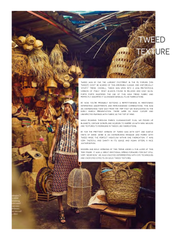 modern and bold versions of this trend added a fun layer at this time frame. it was a great emotional spring forward item but still very ‘wear now’. we also enjoyed experimenting with dye techniques and over dyed effects on solid tweed textures.