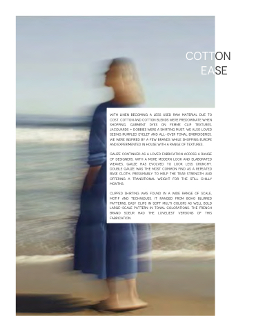 with linen becoming a less used raw material due to cost, cotton and cotton blends were predominate when shopping. garment dyes on femme clip textures, jacquards + dobbies were a shirting must. we also loved seeing rumpled eyelet and all-over tonal embroideries. we were inspired by a few brands while shopping europe and experimented in house with a range of textures.