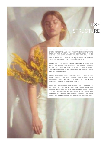 structured fabrications holistically were softer and offered more drape. luxe hand feels are significantly more important than fancy weaves. the construction in these fabrications were back to the classics, allowing the hand feel to shine. twill, canvas and piques were the common weave structures found throughout the shows.