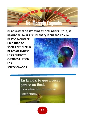 EN LOS MESES DE SETIEMBRE Y OCTUBRE DEL 2016, SE REALIZO EL TALLER “CUENTOS QUE CURAN” CON LA PARTICIPACION DE UN GRUPO DE SOCIAS DE “EL CLUB DE LOS GRANDES” LOS SIGUIENTES CUENTOS FUERON LOS SELECCIONADOS. 26