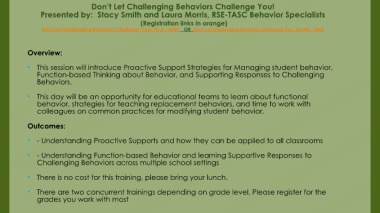 Don’t Let Challenging Behaviors Challenge You- Pk-5 – ONC OR Don’t Let Challenging Behaviors Challenge You- MS/HS - ONC